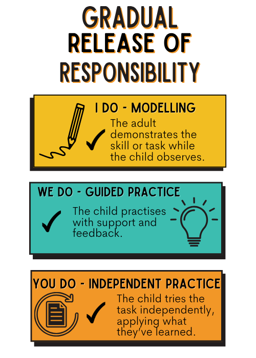 The Gradual Release of Responsibility is a teaching model that helps children learn new concepts by slowly shifting the responsibility for learning from the teacher (or parent) to the learner. It involves three key stages: