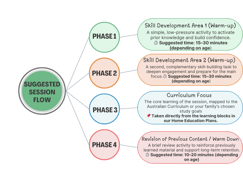 Of course, structure should always reflect your child’s individual learning style and pace. If you're not sure where to begin, here's a sample session structure we commonly use with our own children - designed to balance routine with flexibility.